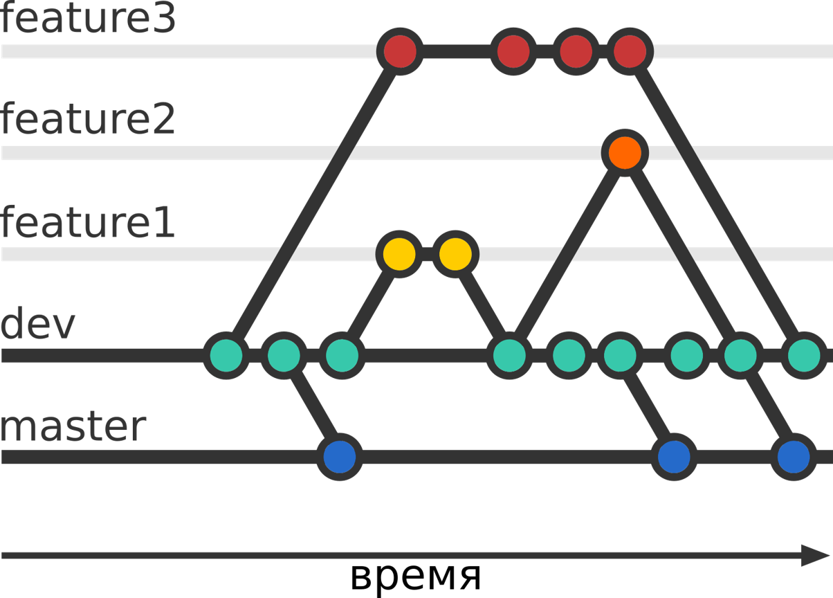 6.GIT FLOW поток непрерывных изменений и обновления програмного обеспечения. В данной модели есть ветки: * master(production), изменения вливаются в нее только после тщательной проверки * develop(dev) - ветка для разработки. В нее вливаются все свежие изменения, и проверяется общая работоспособность кода. * Feature-ветки - отпочковываются от develop, в этих ветках идет разработка различных продуктов, в них работаеют программисты, после завершения задачи feature-ветки сливаются в develop * release - ветка, в которой заливается результат выполненной работы из ветки develop. В данной ветке код тщательно тестируется и заливается в ветку master и develop * hotfix - ветка для внедрения быстрых изменений. Ветка позволяет обходить основной (обычно долгий) процесс внедрения изменений. По завершении работ по решению ошибки, ветка сливается в production и develop